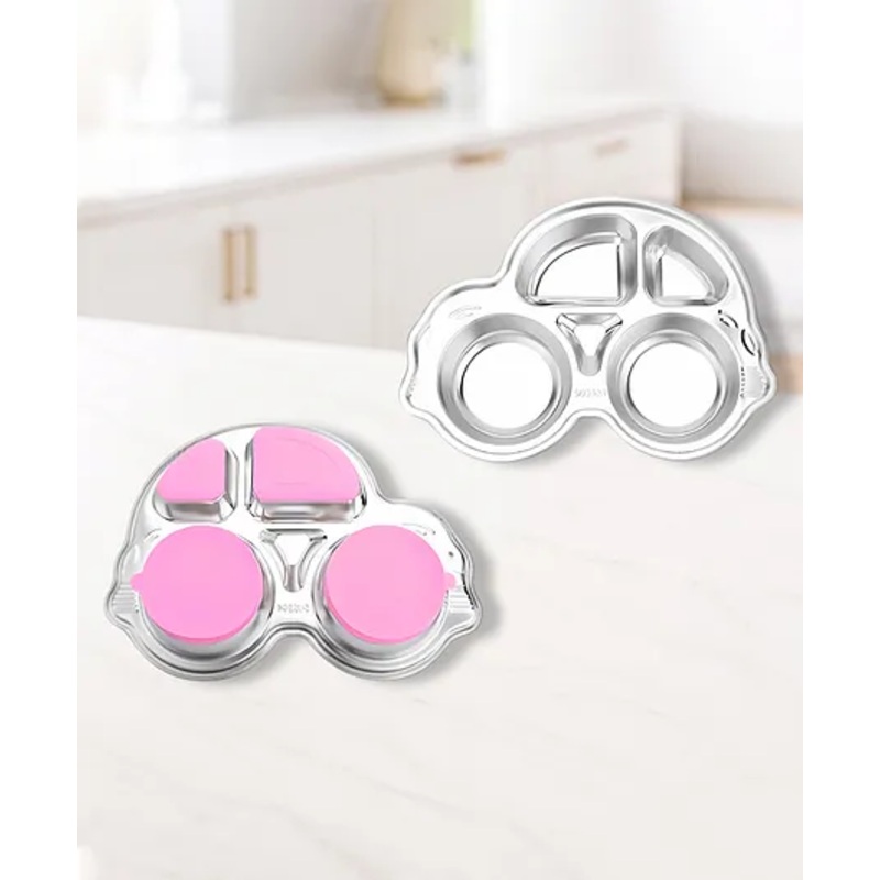 Theoni Stainless Steel Car Shape Suction Plate for Toddlers 4 Section Kids Feeding Plate BPA-Free & Dishwasher Safe (Pink Suction)