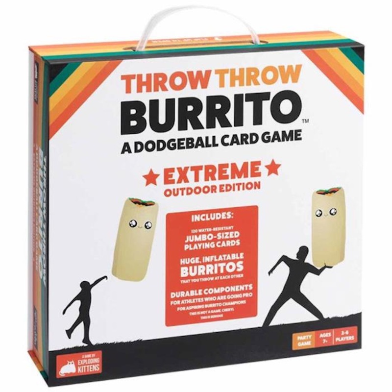 Throw Throw Burrito: Extreme Outdoor Edition has all the fun stuff of the original game, but we’ve seriously upgraded the throwable Burritos. Instead of throwing squishy foam at each other, you get to launch GIGANTIC INFLATABLE BURRITOS at your friends while playing with hilarious oversized cards. Includes super durable, water-resistant cards, nearly-indestructible instructions, waterproof tokens, and two 91cm inflatable Burritos.