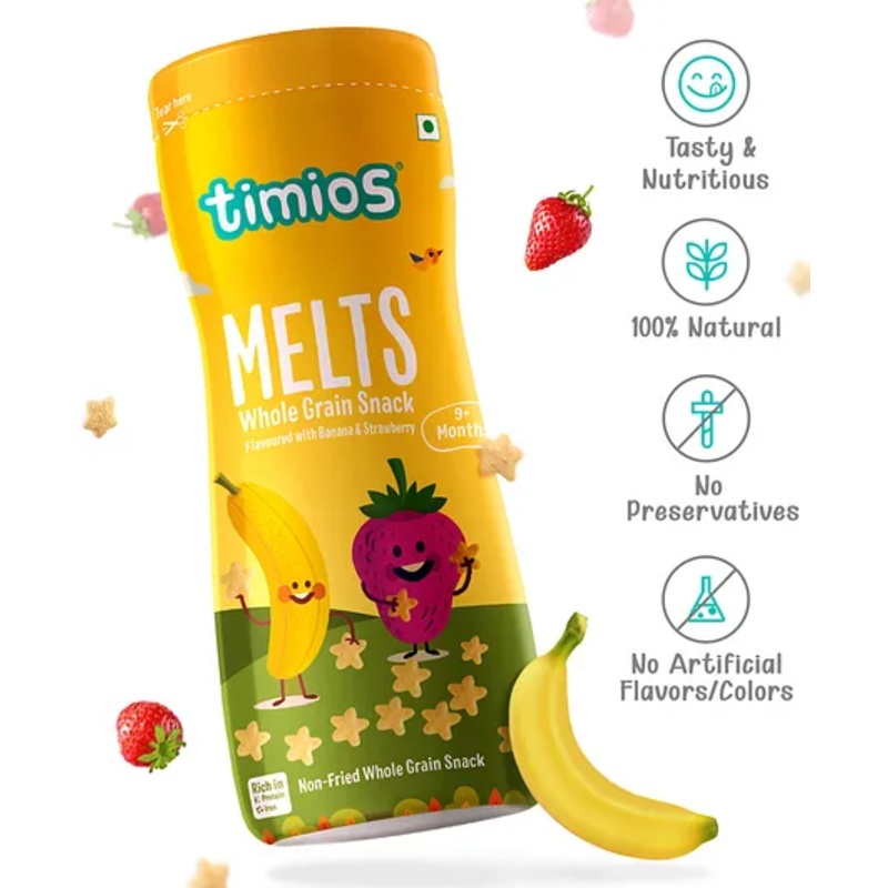 Timios melts are thoughtfully made to be nutritious with the goodness of 100% organic wholegrains like oats, rice & wheat.Seasoned with natural fruit extracts that includes banana and strawberryRich in Iron, Calcium, Protein and is a good source of dietary