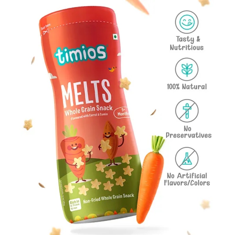 Timios melts are thoughtfully made to be nutritious with the goodness of 100% organic wholegrains like oats, rice & wheatSeasoned with natural fruit extracts & spices including Carrot & CuminRich in iron, calcium, protein and is a good source of dietary fi