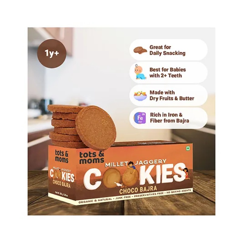 A guilt-free snack option for kids.A perfect blend of Chocolate and millet for a unique, satisfying taste.Free from preservatives and additives. 100% Natural ingredients.Delicious and satisfying, loved by kids!SpecificationsBrand - Tots & MomsType - Cookie