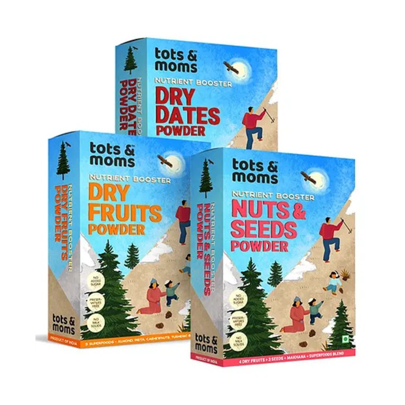 Complaining of lack of nutrients is not an option with Tots and Moms Nutrient Boosters Combo Pack of 3 comprising Dry Fruits Powder, Nuts & Seeds Powder, Dry Dates Powder. Between them, these dry fruits, nuts and seeds of Almonds, Pistachios, Cashewnuts and Nutmeg, and Dates powder provide essential nutrients such as calcium, iron, sodium, phosphorus, magnesium and nutrients that are required in micro-doses for the functioning of all essential systems in the body. With healing, immunity building, weight gain and antiseptic properties, sprinkle them on porridge, gruel, cake, pancake for a health natural power boost.