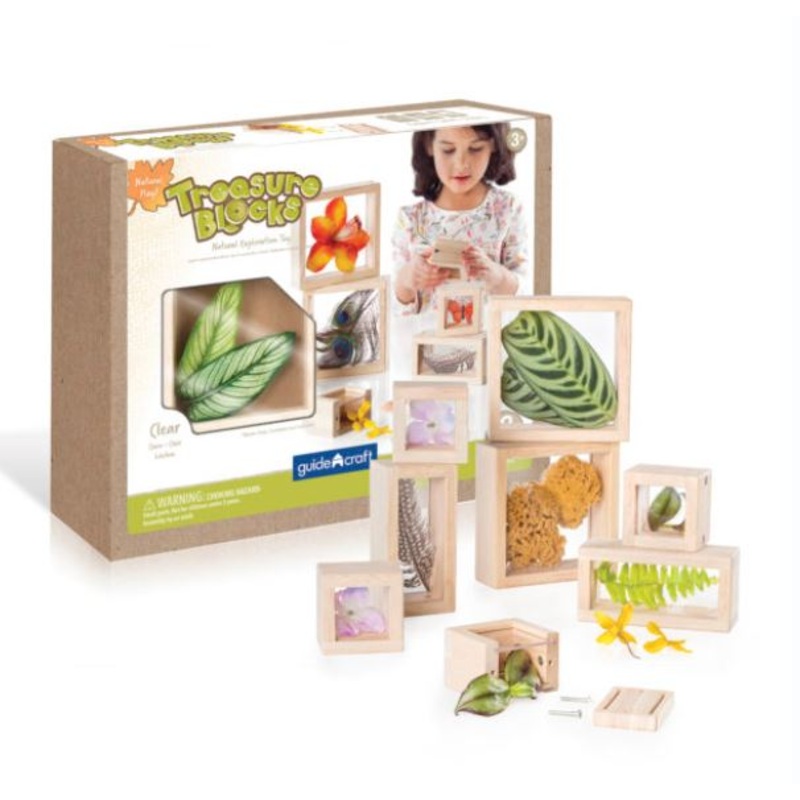 What can we find today? Children can collect trinkets, natural materials and sensory objects in their Treasure Blocks by Guide Craft. Set includes 8 blocks of varying sizes, each with a removable panel held on with 2 screws.Smooth hardwood frames with inse