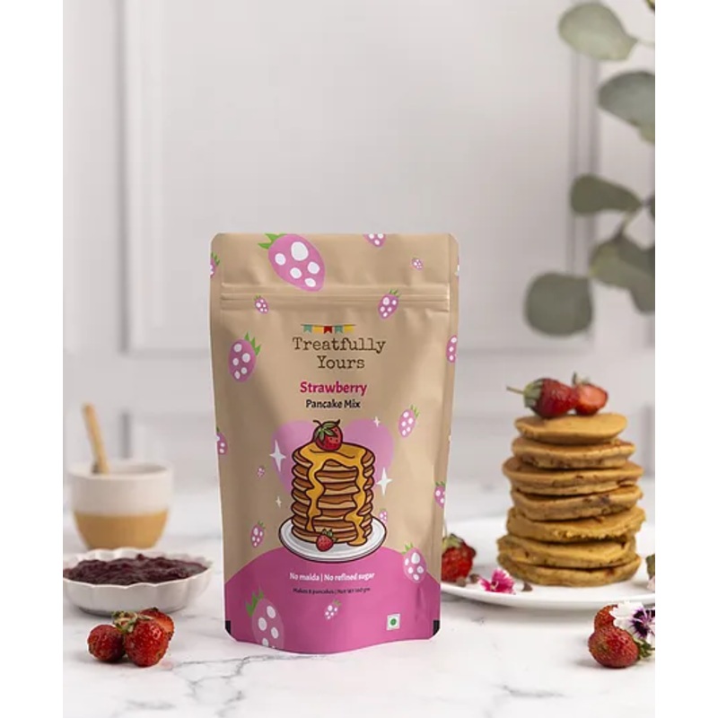 SpecificationsBrand Treatfully YoursType – Pancake mixAge – 2 Years +Product Weight – 160 gm eachIngredientsOat flour, Whole wheat flour, jaggery, cocoa powder, baking powder, bakingsoda, salt, strawberry powderInstructions on how to useStep 1 Add 1 packet of the mix to a bowlStep 2 Mix with cup milk until you have a smooth batter.