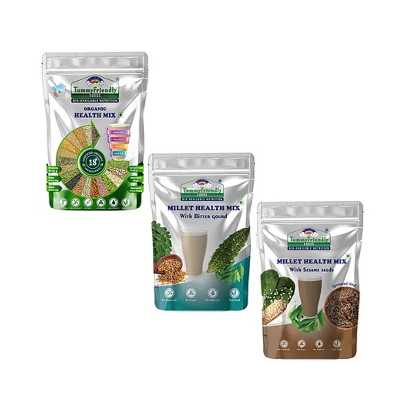 TummyFriendly Foods Organic Health Mix, Bitter Gourd Health mix & Calcium Heath mix Sesame seeds for Kids and Adults. No Chemicals, No Pesticides 300 g (100 g each). | 100% Organic Multigrain Health Mix Drink | Made of Cereals, Millets, Pulses, Nuts, & Seeds | 18 Certified Organic Ingredients | Rich in Protein, Iron, Zinc, Healthy Fat and Dietary Fiber | No Sugar, No Salt, No Milk, No Chemicals, No Pesticides & No GMO | Sathu Maavu Mix for Kids and Adults. Certified Organic Sprouted Sathu Maavu (Multi-Grain Cereal) Porridge Mix 800g Made of Sprouted Ragi, Whole Grains, Pulses & Nuts | Rich in Protein & healthy-Fat Why Sprouting? Because, when sprouted the grains & pulses germinate into Baby plants with the nutritional capacity to grow into big plants. Sprouting reduces the anti-nutrients and multiplies the nutritional content of the food. At TummyFriendly Foods, we are committed to provide the maximum possible nutrition from Real-Food with 18 nutrient-rich sprouted whole grains, pulses, Seeds and nuts. Oats are famous for Beta-Glucan, a soluble fibre that promotes heart health and healthy gut bacteria. Rich in Dietary-Fibre which keeps the little tummy happy and healthy. India-Organic Certified. Certified Organic Food For Little Ones 9 month Shelf-Life No Sugar, No Salt, No Chemicals, No Pesticides, No GMO, No extracts and No Unhealthy Ingredients. Only Real Food Baby food for 3 Year old baby.