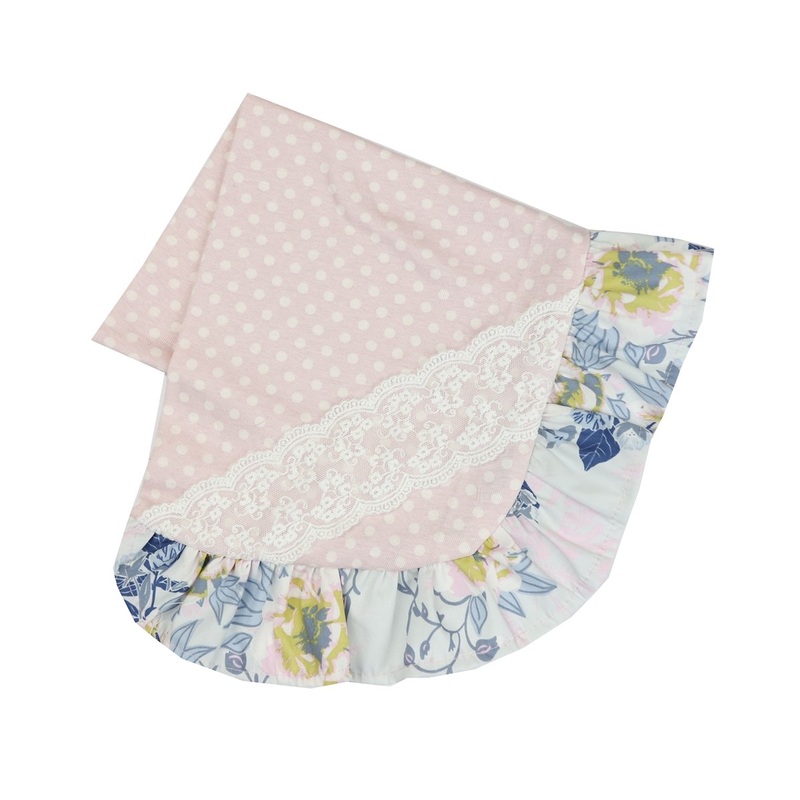 Twilight Blanket. Blanket size is 28X28 inches with 2 1/2" ruffles around."Wrap your little one in cozy comfort and delicate charm with our cotton and lace ruffle receiving blanket. Crafted from soft, breathable cotton, this blanket provides a gentle embra