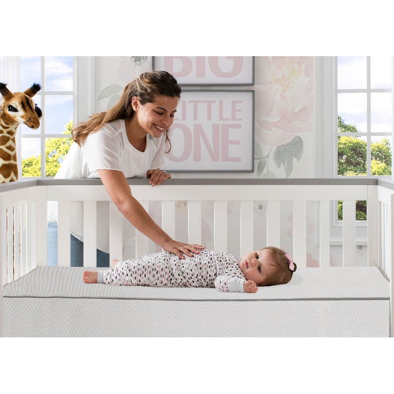 The Twinkle Stars Limited Recycled Fiber Core Crib and Toddler Mattress by Delta Children provides your little one with the support and comfort they need each and every night. The firm support comes from the high-density thermo-bonded fiber core thats made from 300 recycled water bottles. This baby mattress is also incredibly lightweight, which makes it easy to change the sheets, maneuver or flip. Topped with an innovative knit cover, the fabric features a three-dimensional structure that allows air to flow through the fabric and under your baby. The cover is also backed with a waterproof layer that keeps the mattress clean. Finished with square corners to help create a secure fit inside a crib or toddler bed, this mattress is the ideal choice for your growing child.
