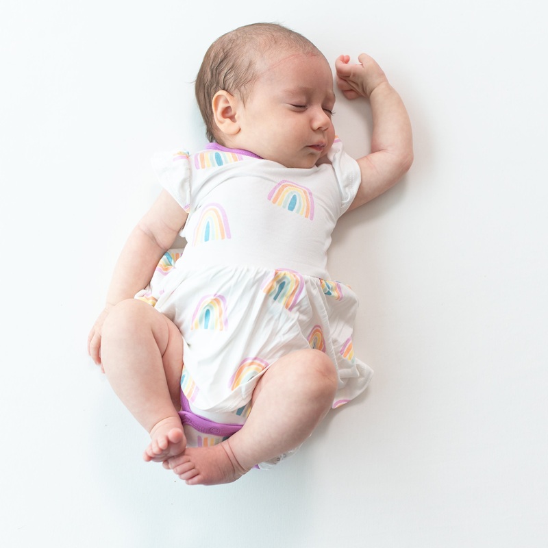 A twirl skirt and ruffled sleeves add the sweetest touch to this classic bodysuit. Adorable, functional, and comfortable, this all-in-one outfit keeps diapers out of sight for a neat and stylish look. Super soft Rayon made from Bamboo stretches to grow wit