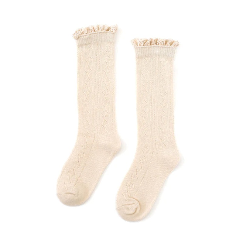 Vanilla Fancy Lace Top Knee HighsMachine wash cold with like colors. Tumble dry low or lay flat to dry.76% cotton / 22% polyester / 2% spandex