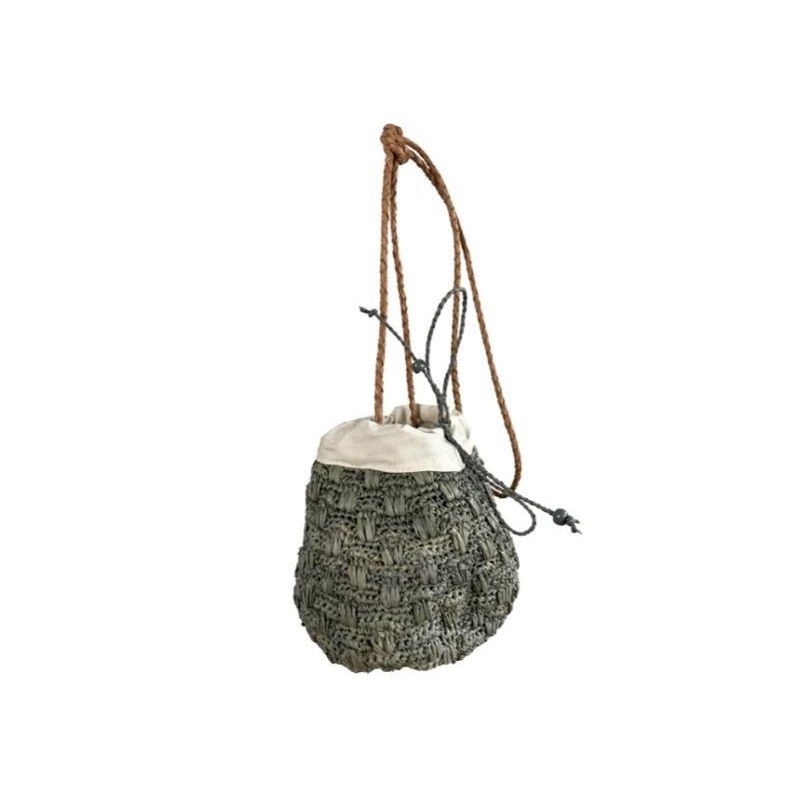 The cutest pouch bag ever with it's long thin plaited leather strap and the gorgeous rosebud stitch, the cotton fabric drawstring top helps tighten your bag hand made and woven from sustainable and durable hand harvested raffia fibers.Beautifully woven inM