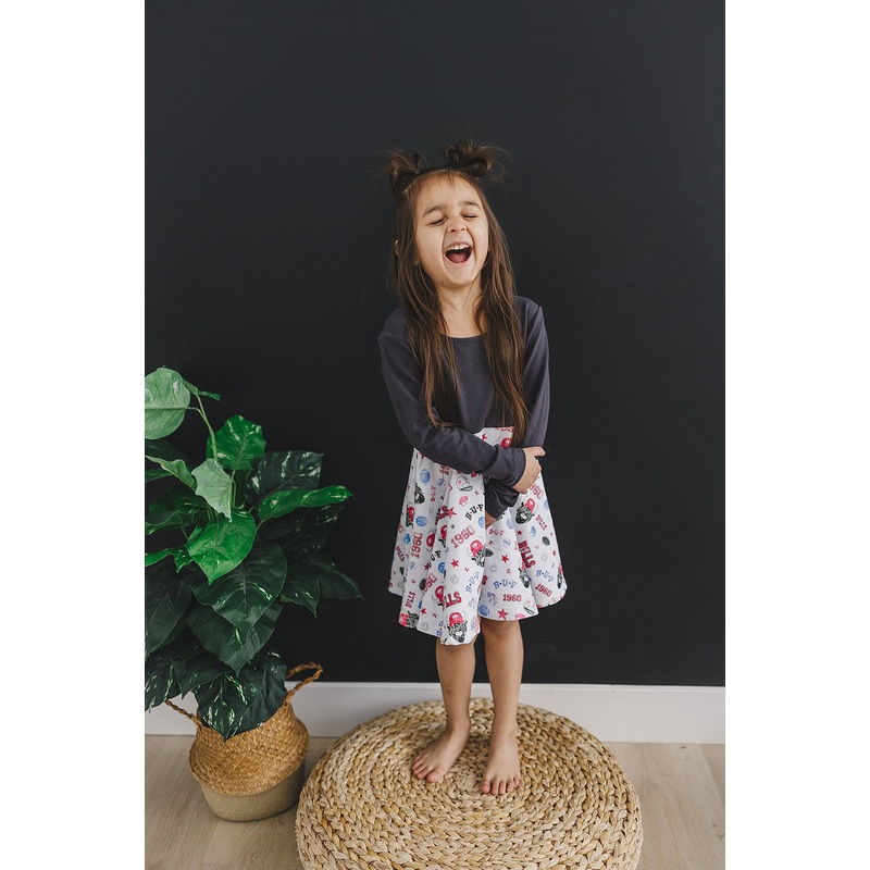 This twirl dress was adopted from our favorite skirtpattern and topped with an adorable fabric bodice. Comfortable and fun to wear, our twirl dresses have quickly become a favorite staple.