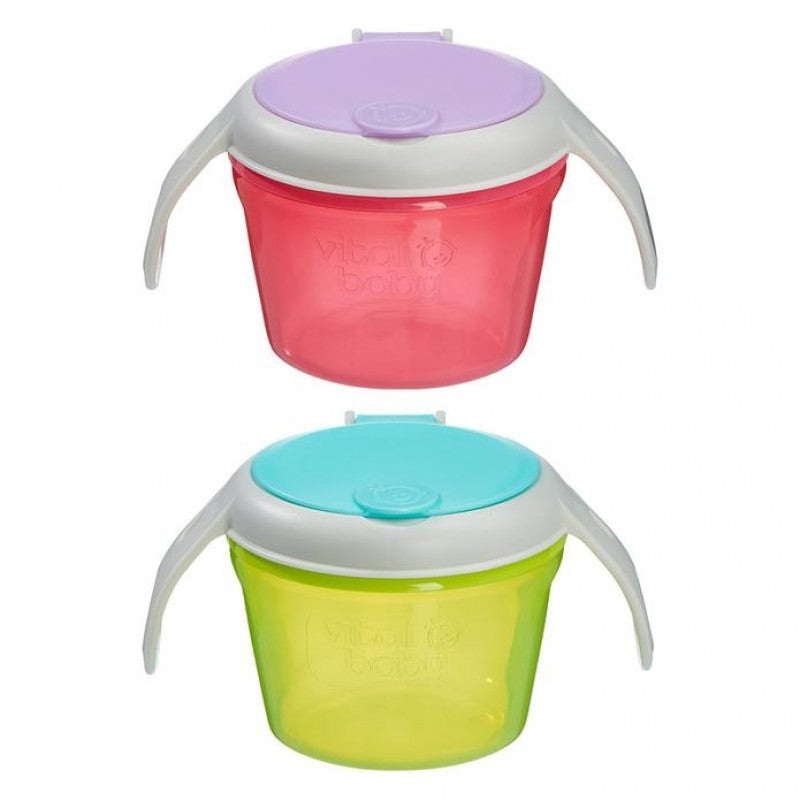 DESCRIPTIONSnack time is now portable! Keep snacks fresh and mess containedwith theNOURISH snack on the go.FEATURESsuper-soft silicone slatted lid gives easy access and non-spill travelcomfy easy-grip handles for little handsfresh seal lid for storage and