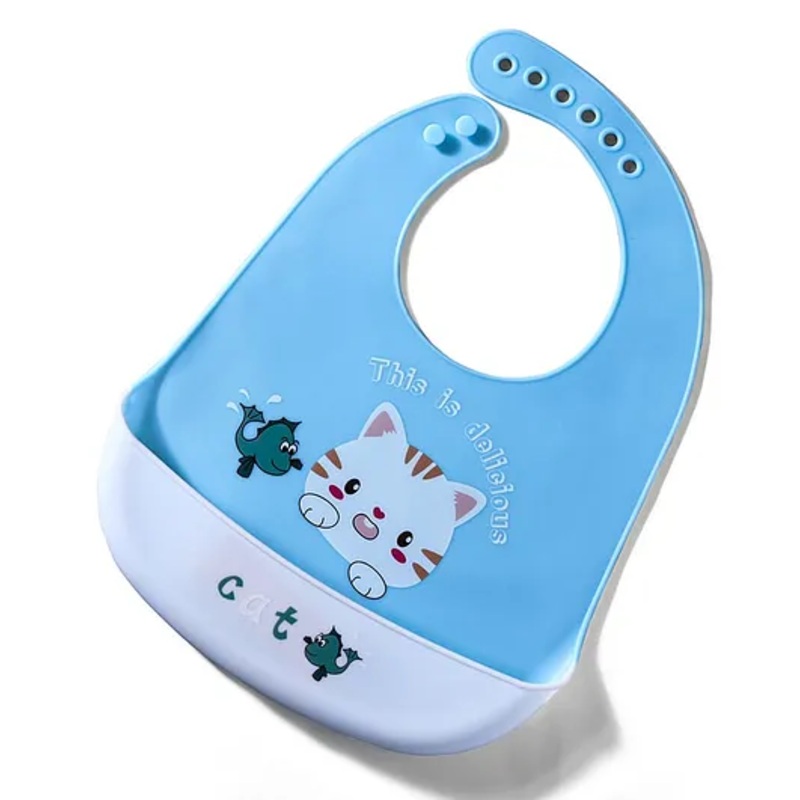 Water-Resistant Baby Silicone Bib, Cat Print Light Blue & White | Food-Grade Silicone | BPA-Free| Crumb Catcher | Adjustable Fit | Travel-Friendly | Reusable Bib|