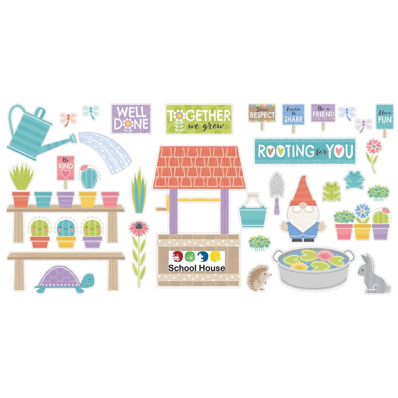 Plant seeds of encouragement and watch them grow! Inspire success through playful touches of nature with this Well Wishes Bulletin Board Set. Combine large wishing well and coordinated accents in endless ways to make an inviting, nurturing space. Great for spreading kindness, encouraging each other, celebrating achievements, and setting goals.