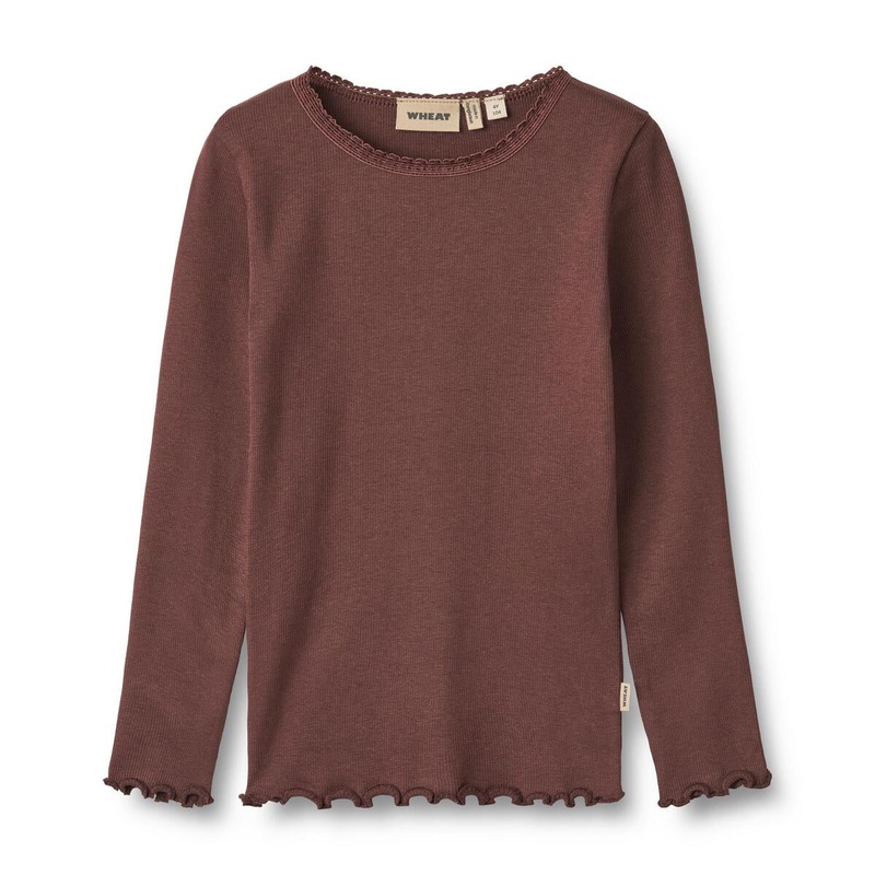 Long-sleeved rib T-shirt in a soft mix of organic cotton and Lenzing modal for children. – Fitted and stretchable – Lace details at neckline – Overlocked edges at the cuffs and hem – Ribbed structure Wheats T-shirts are a true essential in your childs wardrobe, as the T-shirts are soft and comfortable for your child to wear. The T-shirts are available in beautiful colours and hand drawn prints, which are made by Wheats in-house design team. They can easily be styled with pair of trousers or a skirt, or with a knit on top depending on the weather and occasion. It is also perfect as an extra layer underneath a dress or overalls on colder days. Composition – Standard 100 by OEKO-TEX – 48% Organic cotton, 48% Lenzing modal, 4% Elastane
