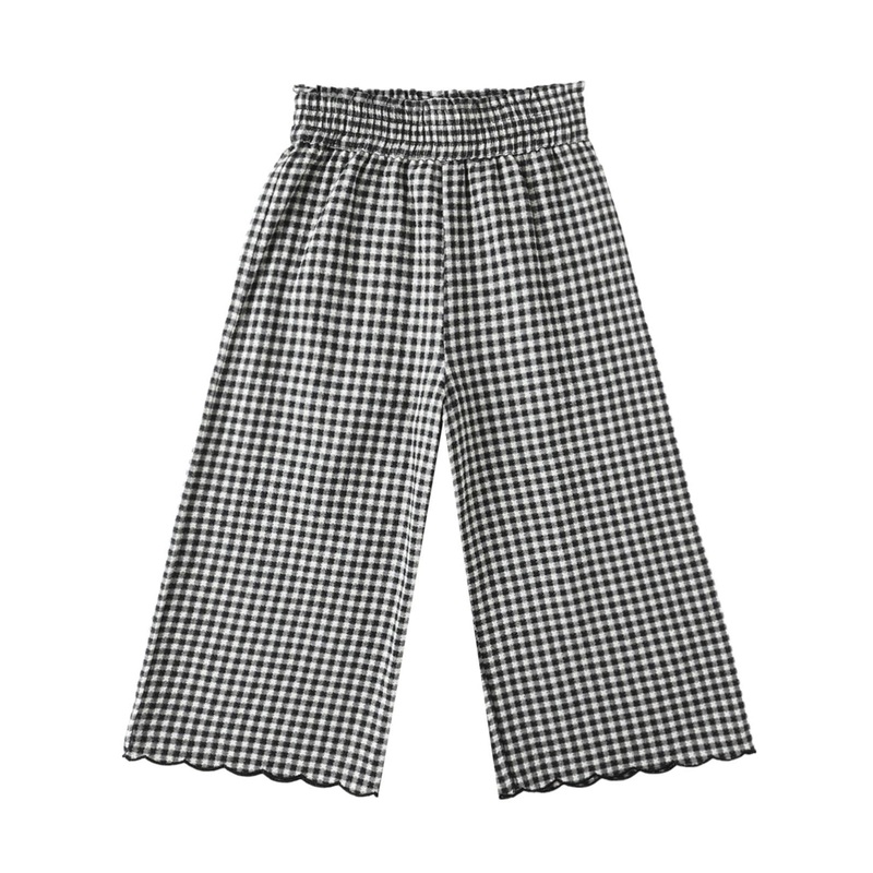 Clean lines, scalloped hem, and relaxed comfortthese wide-leg pants feature an elastic waistband for a perfect, pull-on fit.Details:Made of 100% cottonFeaturing Rylee + Cru's 'black gingham' printElastic waistbandCare:Machine wash cold. Lay flat to dry.