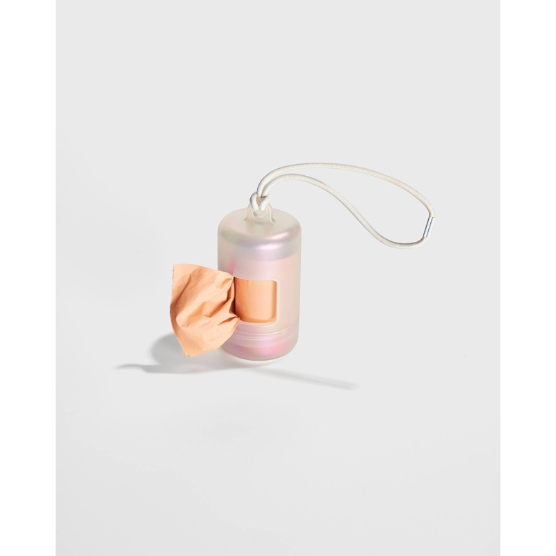 A happy home for poop bags. Complete with an elastic strap to easily attach onto any leash or tote, a twist top to make reloading a breeze, and a complementary roll of our eco-friendly Poop Bags!Materials:Soft-touch plastic shell and elastic band with iron
