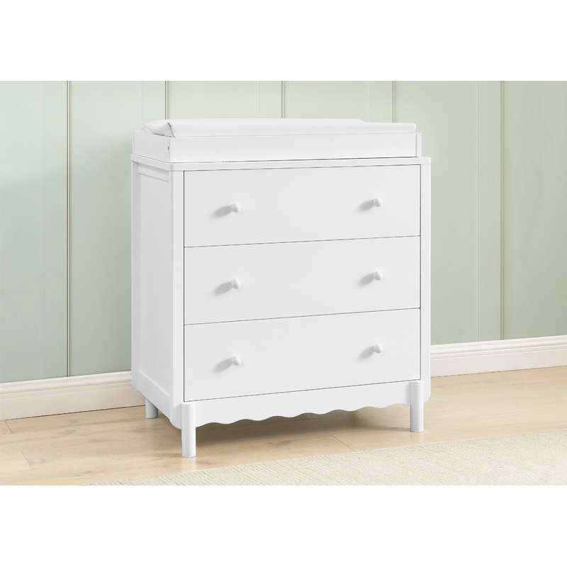 The William 3 Drawer Dresser with Changing Top by Delta Children adds a touch of playfulness to any space with its charming scallop detailing paired with round feet and knobs. This spacious storage piece serves as a sturdy changing table too, with the included changing topper (changing pad sold separately). When your child grows, just remove the topper, it easily transitions into a stand-alone dresser. For your childs safety, this dresser is outfitted with an interlocking drawer system that limits the number of drawers that can be opened at one time. Plus, its GREENGUARD Gold Certified, which means its built to contribute to cleaner air for a healthy home. Available in Natural Sandstone and Bianca White. To complete the look, pair this dresser with the coordinating William 4-in-1 Convertible Crib.This dresser is tested to meet the current requirements of ASTM F2057, the mandatory CPSC safety standard that protects young children from furniture tip-over incidents. For your childrens safety, only purchase dressers that comply with this standard. For additional security, Delta strongly recommends that all dressers in your home be anchored; all Delta dressers include a wall anchor. To learn how to properly secure your dresser, please see the product assembly instructions or visit our website.