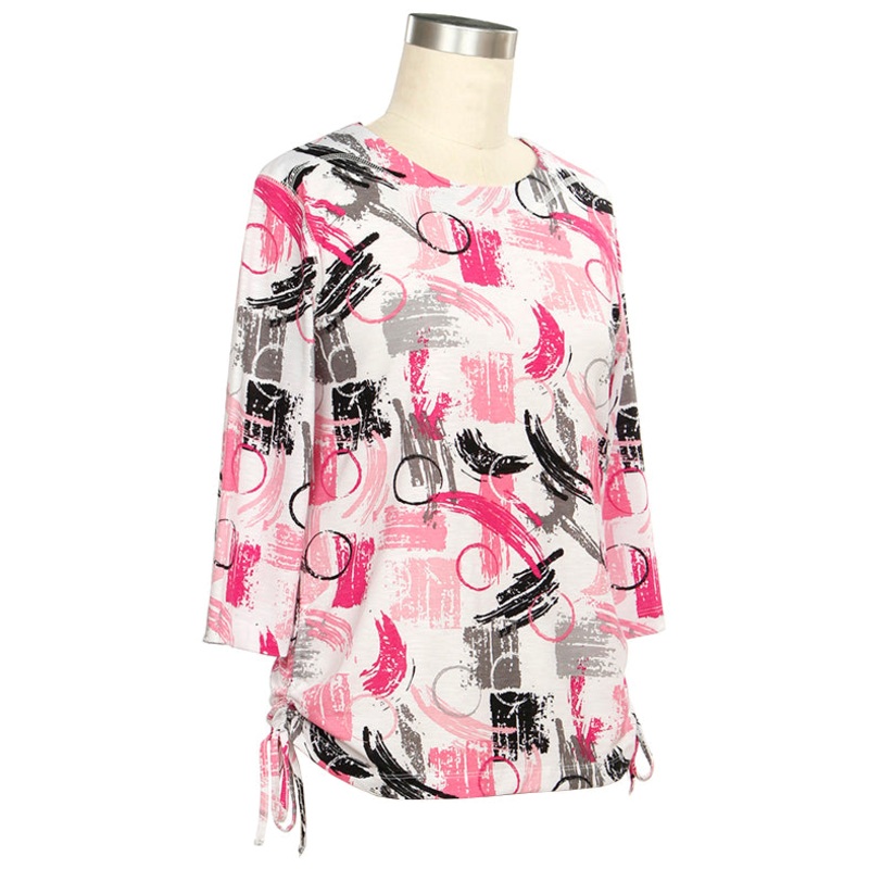 This 3/4 Sleeve Molly Print Top is the perfect blend of style and comfort. It's made of soft and stretchable knit fabric featuring a bold brushstroke print and stylish side ties.Fabric: 95% polyester, 5% spandex3/4 length sleevesMachine washable