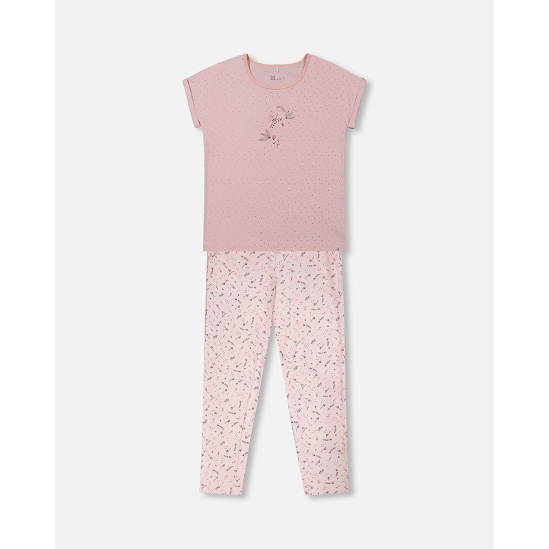 Mom can match her little one with our Women's Printed Organic Cotton Two-Piece Pajama Set Small Pink Flowers on Pale Pink Background. This adult PJ set features a short sleeve tee with solid rolled cuffs, an allover polka dot and flower print, and a round