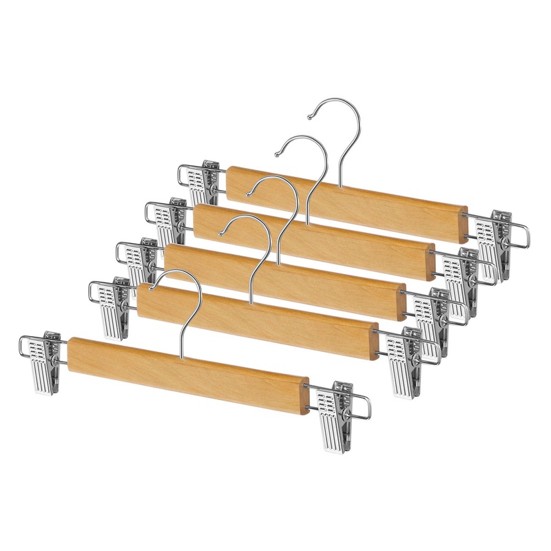These Wooden Skirt Hangers, Set of 5 6026-341 feature a chrome neck, clear lacquer finished wood with padded clips.Set of 5