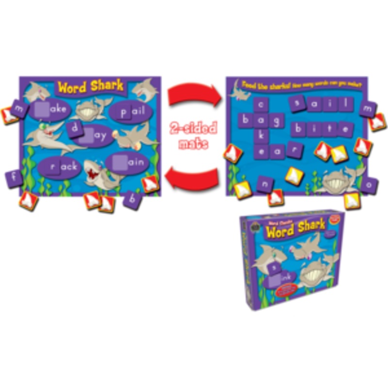 The fun begins when each player chooses a Word Shark mat. Player 1 draws a consonant tile from the pile and tries to add it to a word ending on his or her mat to make a word. If the letter cannot be used to spell a word, it is returned to the pile. Then the next player draws a tile and tries to make a word. The first player to fill a mat with words wins!Use the other side of the mats to spell as many words as you can! Variations allow for crossword puzzles, center activities, cooperative activities, or timed contests!-Use the games to build reading and spelling skills.-Children learn about word families.-Ideal for pairs or small groups of children (1-10 players).-Great for individual instruction and tutoring at school or at home.-Variations allow for different skill levels.Includes: 10 two-sided mats, 58 vowel tiles, 92 consonant tiles