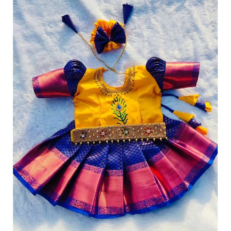 Yellow and Royal Blue Pattu Pavada Without Hip belt