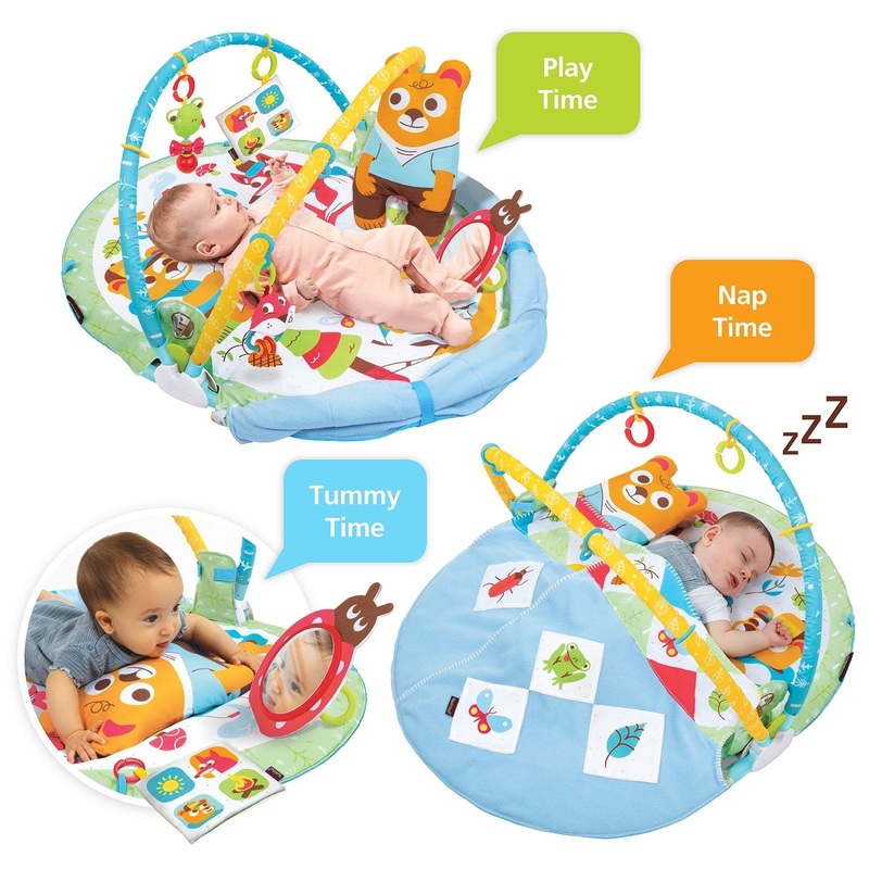- Sit-Up play– When your baby is ready to sit up at stage three, easily transform the playmat into asafe and harnessed seat.Slip the pillow into the special pocket under your babys feet to ensure enhanced comfort. Choose one of two seat safety positionsa snug fit for younger babies 5 months plus, and a slightly larger fit for babies 8 months plus. Promote sit and play time by positioning the accessories on the arch in front of them for eye-level engagement or put the rattling shoes on your babys feet to encourage leg lifting.
