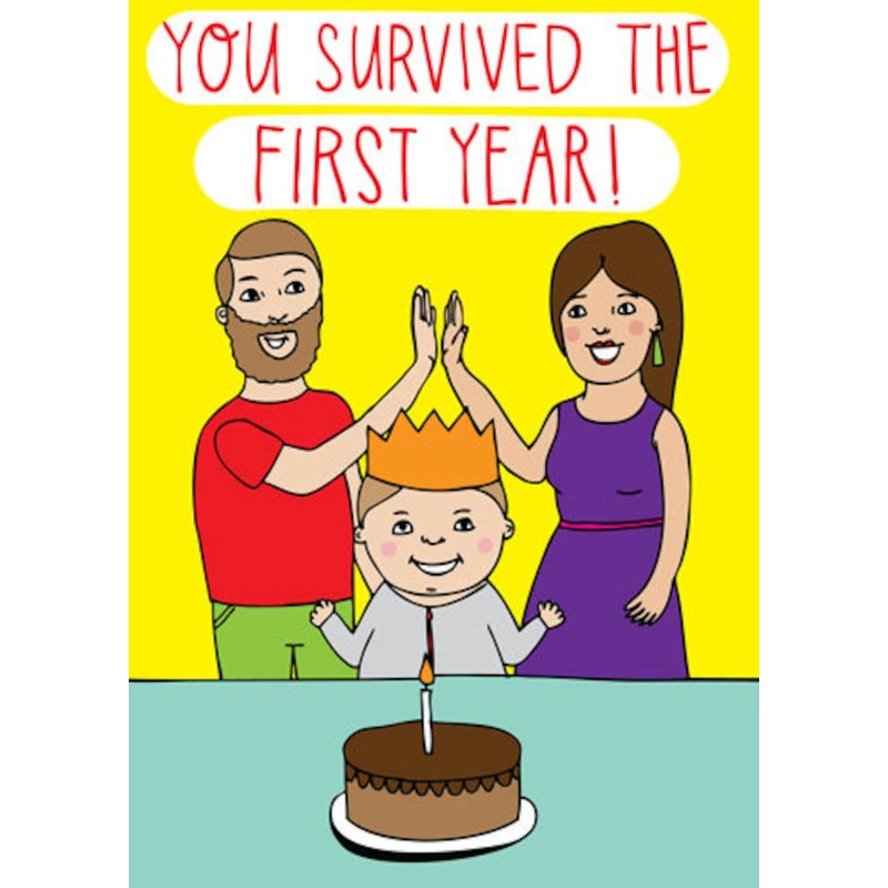 This greeting card is for a child turning one, but it is all about the parents, because surviving that first year is a big deal! Children’s birthday cards are often cute and sweet, but we wanted to make one that was honest and funny and summed up excactly how new parents feel when their kid turns one.