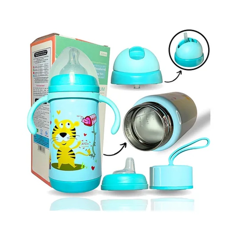 ZoZoBaa 4 in 1 Double Walled Vacuum SS304 Steel Baby Sipper, Heat Protective, Leakproof, Odourless,BPA Free| Bottle with Spout, Nipple, Weighted Straw, Cap & Handle, 300ml, Blue
